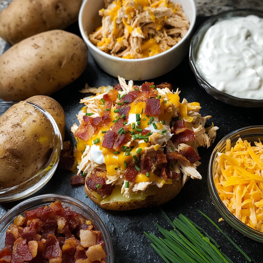 Prepare the Toppings: While the potatoes are baking, make sure your chicken is shredded, your bacon is cooked and crumbled, and your cheese is shredded.